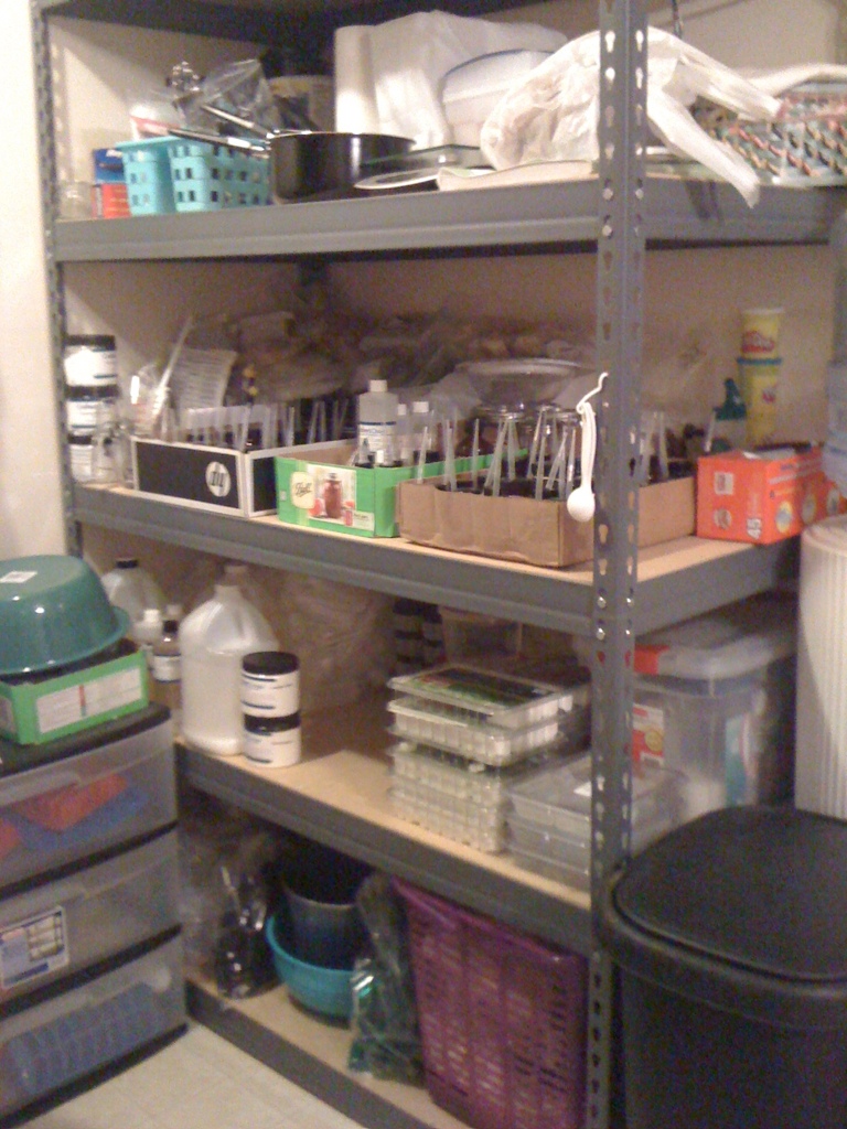 My upper shelf holds glass jars, bulk containers like the oats that I grind, the scale, and my sewing machine. Below that is my delightfully fun shelf of ingredients. Below that are different soap, lotion, shampoo, spray, and massage/body oil bases along with a few prepped plastic jars. At the bottom is mostly a ton of empty containers that I have been working at collecting during sales, so that I never have to make a customer wait a few weeks until I have the appropriate container. My purple yarn basket has become a bottle and lids basket for easy access. I thought ahead and got a tiny trashcan to take to events for people to toss sample spatulas, wet wipes, and paper towels. (Cue pat on my shoulder for truly learning from the cancer walk event!) The plastic unit to the left is full of soap molds (going to be a little fuller in a few weeks since I have four more silicone molds I found on sale through a mail order catalog. I figure that the silicone molds are an investment, so if they’re on sale and I can swing it, they shall be mine *failing miserably at the dramatic imitation*). You would be surprised (unless you are familiar with my need for things to be orderly, like my spreadsheets *grin*) how much of a relief being organized and stocked up is. Later today I’ll pull down my lotion-dedicated pots (on that upper shelf too) and start making new lotions hopefully. So exciting!