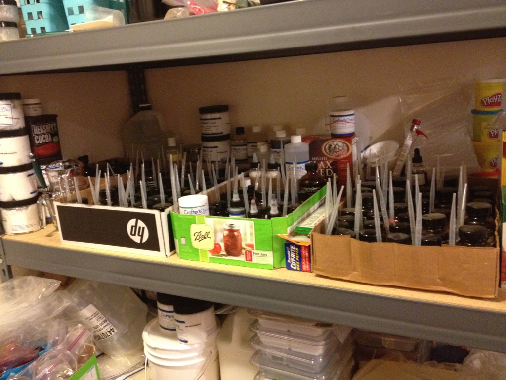 If I mention ordering new scents, please slap my hands. Lol. That entire shelf with the forest of pipettes is filled with FOs and EOs. Remember when I was amazed with the first flat of them? *blush* I think I need to admit that I am an addict and have a problem. Lol. The left flat is food, middle EOs, and right is for non-food FOs. I hate to think of just how expensive that shelf is! Lol. I’m so glad that I don’t have to worry about earthquakes shaking that shelf 😉 I must admit, though, that I am thoroughly stocked for summer, except for one more order of goat’s milk base. No matter how much insomnia I have, I’m going to avoid my wholesaler’s website like the plague and stop my late night shopping *grin*
