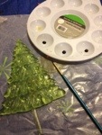 I had taken a picture for myself of preparing to paint. I think it’s kind of cute so I’m popping it up here. I started with a drop of each color I was going to use, although a few needed more than one, plus a bit of water for thinning when needed, and a paper towel for dabbing at bad accidents and cleaning the brush. If you ever paint soaps load the brush with the dye. It will seem like way too much and at first you’ll worry about dying the skin, but it looks the best for the ornaments and after testing I found that I didn’t have any problems with the dye. The shower keeps it from sitting on the skin.