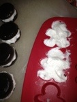 Anyway, I got in and decided to finish making a second batch of the sandwich cookie soaps. I had poured the wafers a few days previously, plus I had left over “frosting” from the last batch that I just had to figure out how to make reusable. I had thought out a few techniques that might work for reusing it and happily the first one worked perfectly. I was all gloved up, wafers lined up like little soldiers beside the scale, had the first wafer on the scale, and the piping gun in my hand when I noticed a tremor starting up. My good time frame was up just from the prep work. I knew I had about 5 minutes for the frosting to stay soft enough to pipe though, so I started to frost the bottom wafers. I try to get exactly .25 oz of frosting on each wafer. Holy smokes! The more I did and tried to stay steady the more pronounced my tremor got. About halfway through I was cracking up because they were starting to look like a drunk person had put the sandwiches together. *grin* Some went a bit over the amount, frosting ended up all over the place, and I shook so hard at the end that one almost flew into the mixer’s bowl! Rofl. Thankfully I got them all done, even if they look a bit more whimsical than realistic this round, but had a dash bit more frosting in the tube. As little as there was I wasn’t going to store it and try to freshen up to reuse yet again, so I grabbed a mold really quick and piped the frosting into two gingerbread men. I figure they’ll do a soft set and I’ll just enjoy the odd little soaps. They’re still incredibly mushy today (maybe because they don’t have as much surface exposed to the air??), but what cracked me up is how rough they look. Hopefully you get a chuckle out of the following picture too. 🙂