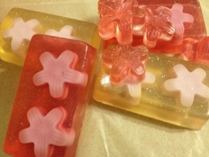I worked on the ice cream cone soap for awhile, but then got the urge to make some embeds while it cooled. I got a small flower silicone mold over the summer and decided that would be really cute embedded in a clear bar or round. The first batch I made another pour of the strawberry used in the cone, but then I decided to totally explore one of my untested ingredients. *struggling to control the excited squirming* I went unscented and will scent the outer soap, instead of a two scent layer soap like the first batch, and made them a super soft lavender. Okay, okay, I’ll be honest. I was shooting for a darker shade, near violet, but after 5 drops I decided a lavender was a better option than running the risk of turning someone’s skin purple. Lol. Anyway, I pulled out the untested iridescent soap safe sparkles and mixed it into the soap. I saw the fantastic shimmer when the soap caught the light as I poured into the flower mold. I really hope that the sparkles stay suspended in the soap instead of sinking, but it might be really cool if they do sink to the front. My biggest hope is that the soap sparkles catch the light as well when set as while they were being poured. I can just see a little girl in my mind’s eye lifting her two-toned soap up to the light and smiling as it shimmers. I had to fight the urge to pop the mold into the freezer for a quick set, but I did the right thing and will let them set properly. It’s still a bit like being five and waiting for Eve to finally become Christmas morning though. *grin*