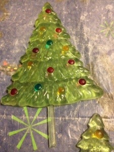 I have to admit that I’m really happy with these soaps. It took awhile to get the hand painting down, but I loved every moment of it. *cheesy smile* For once I even like that they’re not perfect – it adds to that happy, homemade vibe I think. I will try to darken the tree color in the next batch though. When I started the pour I noticed that because the molds are so shallow the soaps are lighter than it looked when it was in the measuring cup. Some days I have big brain farts. Lol. I also think that I’ll trim off the tree stumps. They’re actually where lollipop sticks should be placed for making lollipops (it’s really a candy mold) and since it’s so shallow I’m having a problem with them breaking off. I think that it might work out better if I just take them off and not worry about it. They’d be a LOT easier to package too! Lol. I’m still stumped over that part. They’re really big, so they don’t fit in any crafter bags and I really don’t think a gallon size ziploc would look overly professional. *grin* I may end up with that holiday colored Saran Wrap I guess. I’m always up to hearing ideas if you want to share. *smile* Anyway, I hope you like these too.