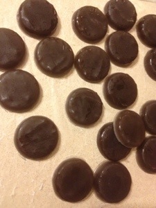 I am beyond excited at how the cookie sandwich soaps have turned out so far. I was shooting for a chocolate brown color, but the brown pigment I have wasn’t looking overly chocolatey, so I added the tiniest dash of black matte powder. I had never used powder coloring before, but of course I had researched and knew that a tiny bit goes a long way. I didn’t realize that a sixteenth of a teaspoon was a lot in this situation. Lol. I was kind of upset when I was whisking the batch and saw how dark the soap was turning, but you know me and waste…I decided to pour them and I could remelt for something else later, but they’d be in handy wafers instead of a massive clump. As they began to set I noticed that they continued to darken (I think it was actually the settling of everything from all of that whisking since it took awhile to incorporate the powder). I’m so happy with them now though! They look like chocolate grasshopper cookies or York miniatures. I can’t believe it. I still need to make the frosting to sandwich and I’m going to let that look rather whimsical so that these don’t look too realistic. In the picture they’re a little glossy, but that will dull in a bit. I had a lot of trouble getting them to release from the molds and popped them in the freezer to contract, to unmold. Yeah, um…*blush and suddenly looking all around* I popped them in as I prepared the supplies to paint the trees and I lost all track of the entire world once I started painting. After I was down I was on cloud 9 and got on SL for a couple of hours. I came out to make my tea and was tidying up when I saw an empty mold sitting on the counter. *facepalm* I ran over and yanked the wafer molds out of the freezer. I had left the tree mold on the counter since I was going to add the wafer ones after the ten minute cool down, so I’d only do one round of equipment washing (I take extra measures for that, so it’s a real pain to do it in multiple rounds). Thankfully these soaps won’t be ruined, but I need to let them slowly return to room temperature. If the condensation stays on them I run the risk of the fuzz popping up on them. It’s a common issue that occurs because glycerin is a humectant, so it draws water from the air, and then whatever itty bitty particles are in the air stick to the moisture, making the soaps look fuzzy. The fuzz can sometimes be wiped off carefully with a damp towel, but that can leave a mess too, and I’d rather write off a soap’s cost than sell something that I’m not proud to have my name attached to. So, I’m going to set an alarm next time I have to use the last resort of freezing a mold. Lol. Anyway, I think they’re adorable and can’t wait to make (and post) Part 2. *grin* Let’s hope that part turns out well too!
