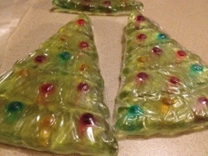 I was very excited to get my delivery from the wholesaler today. With the superstorm I wasn’t totally sure things would run on time. I always love that feeling of Christmas that comes with deliveries – opening the box(es), digging through the packing peanuts for little treasures, and getting to check everything out up close. I am even happier to tell you that the shrink wrap that I ordered for the Christmas Tree Soap worked nearly perfectly. *happy dance* There is a bit of trimming that needs to be done before shrinking, but otherwise they are great. I had one little oops moment though. Apparently I got a little over zealous with the hair dryer (it’s oddly difficult to act like an adult when working with shrink wrap and even harder to be careful). I went to flip the thinnest tree and it felt weird. I had accidentally warmed a spot on the edge a bit too much and it started to melt! Whoa! I’ve set it aside to deal with later. It still works fine and it’s a tiny spot, but I don’t want to have it in with what I’m selling. I’ll either gift it or sell at a reduced rate…unless I decide to amuse myself by slipping bits of it into my husband’s other soap and make him smell like jellybeans. Lol. Okay, okay. There are a couple of things that make it difficult for me to act like a serious adult. *grin* Anyway, I had to share because I’m so pleased with how sharp they look. A little side note – I noticed as I was wrapping them that the hand painted ornaments have begun to bleed a bit, which is actually cool because it helped give a soft, even more Christmassy look to the soap. It reminds me of taking a picture of a real Christmas tree and the lights having that pretty halo around them when they’re lit. Woohoo!
