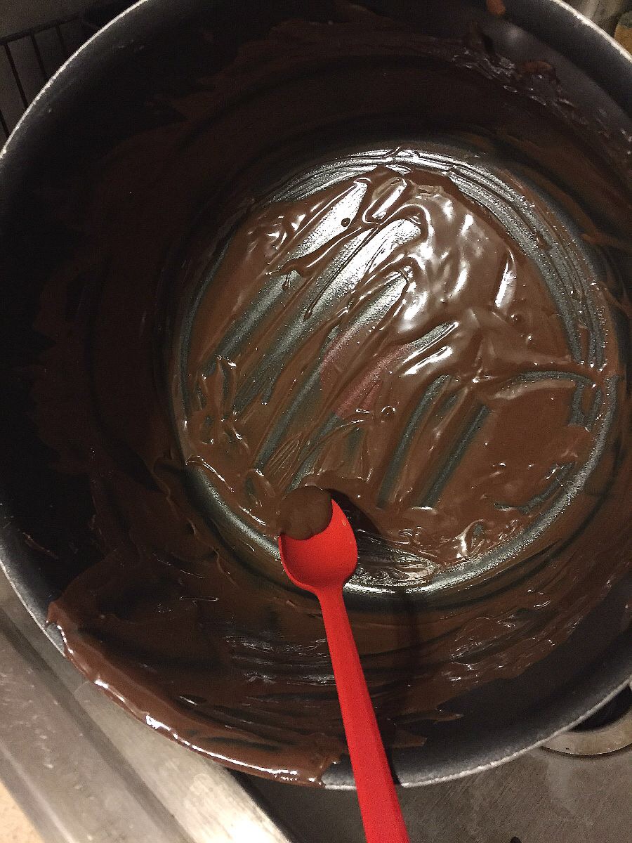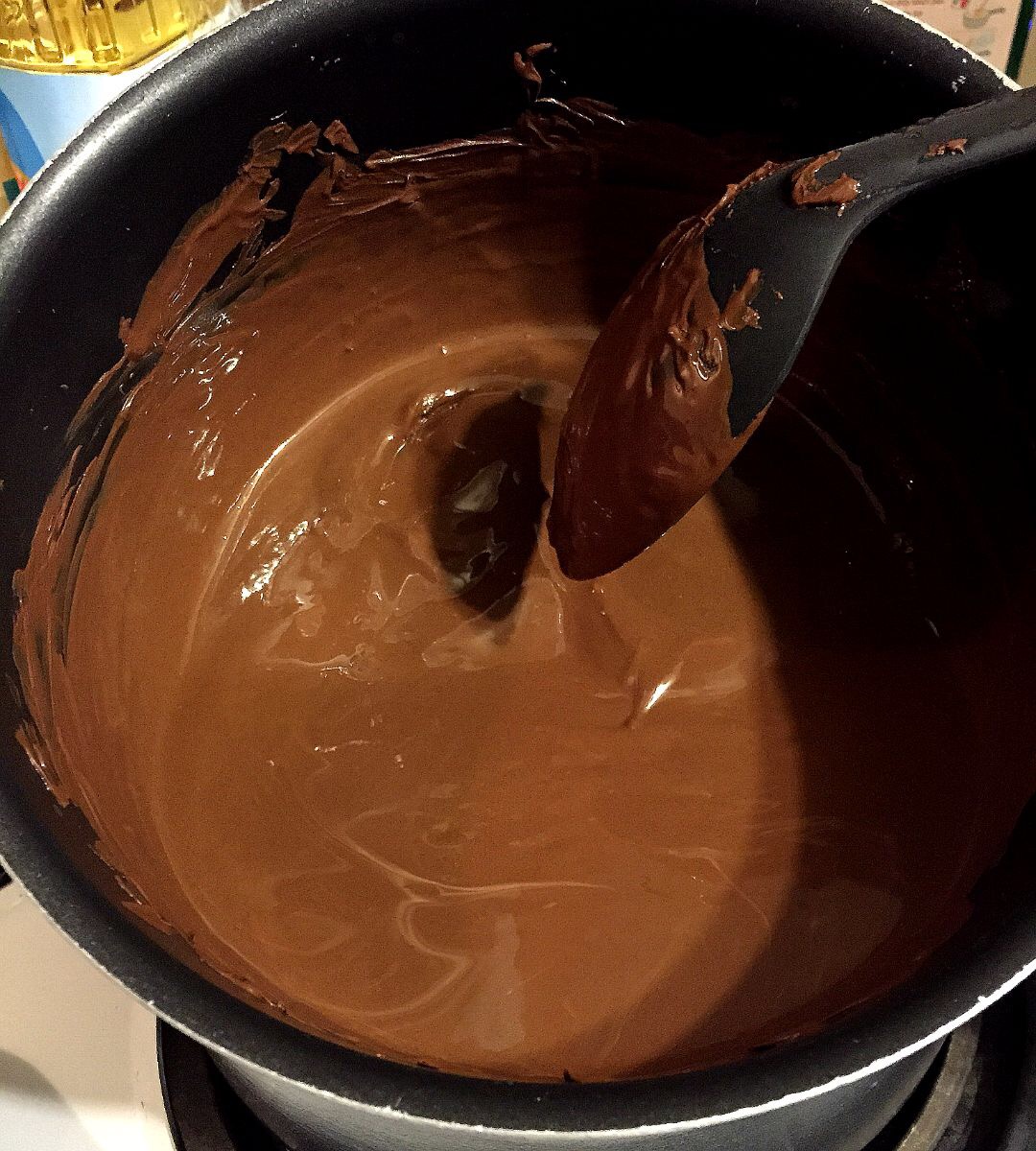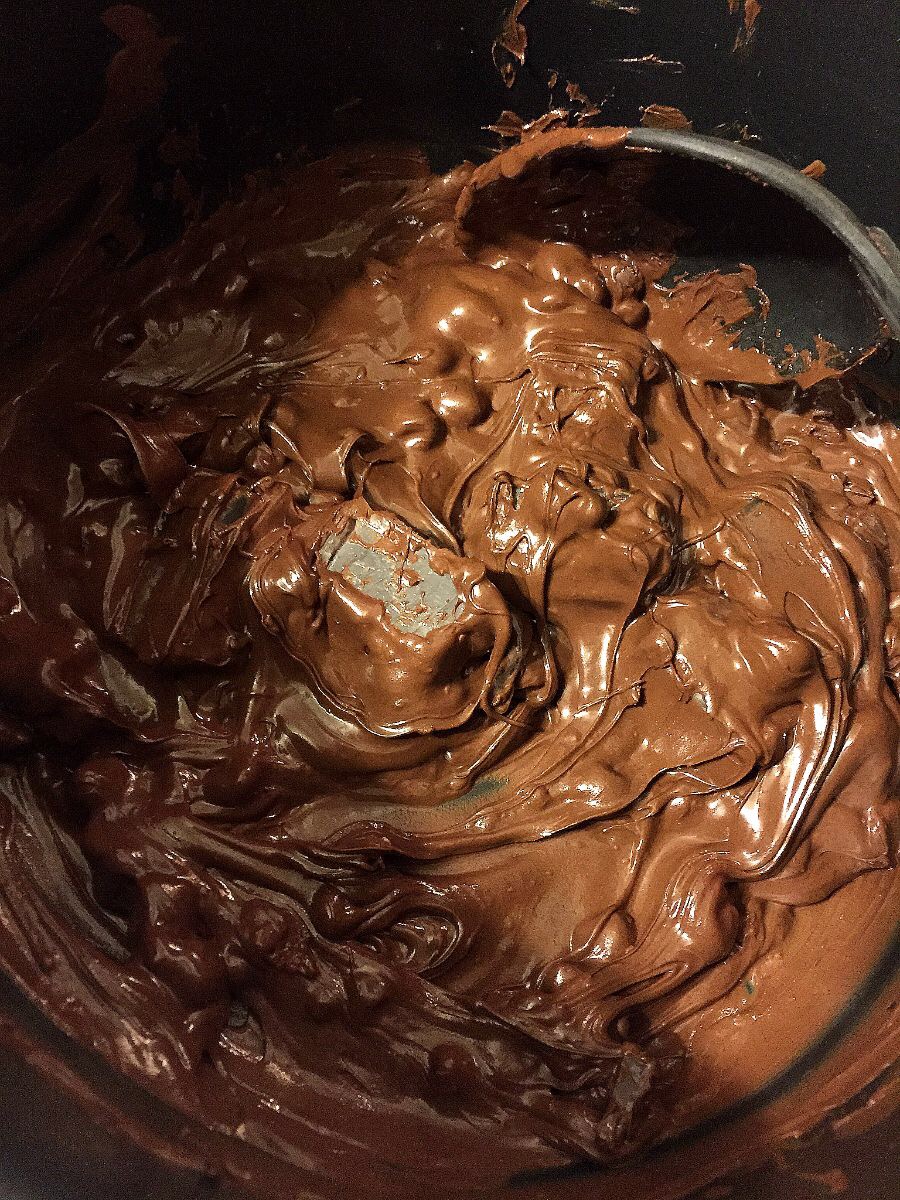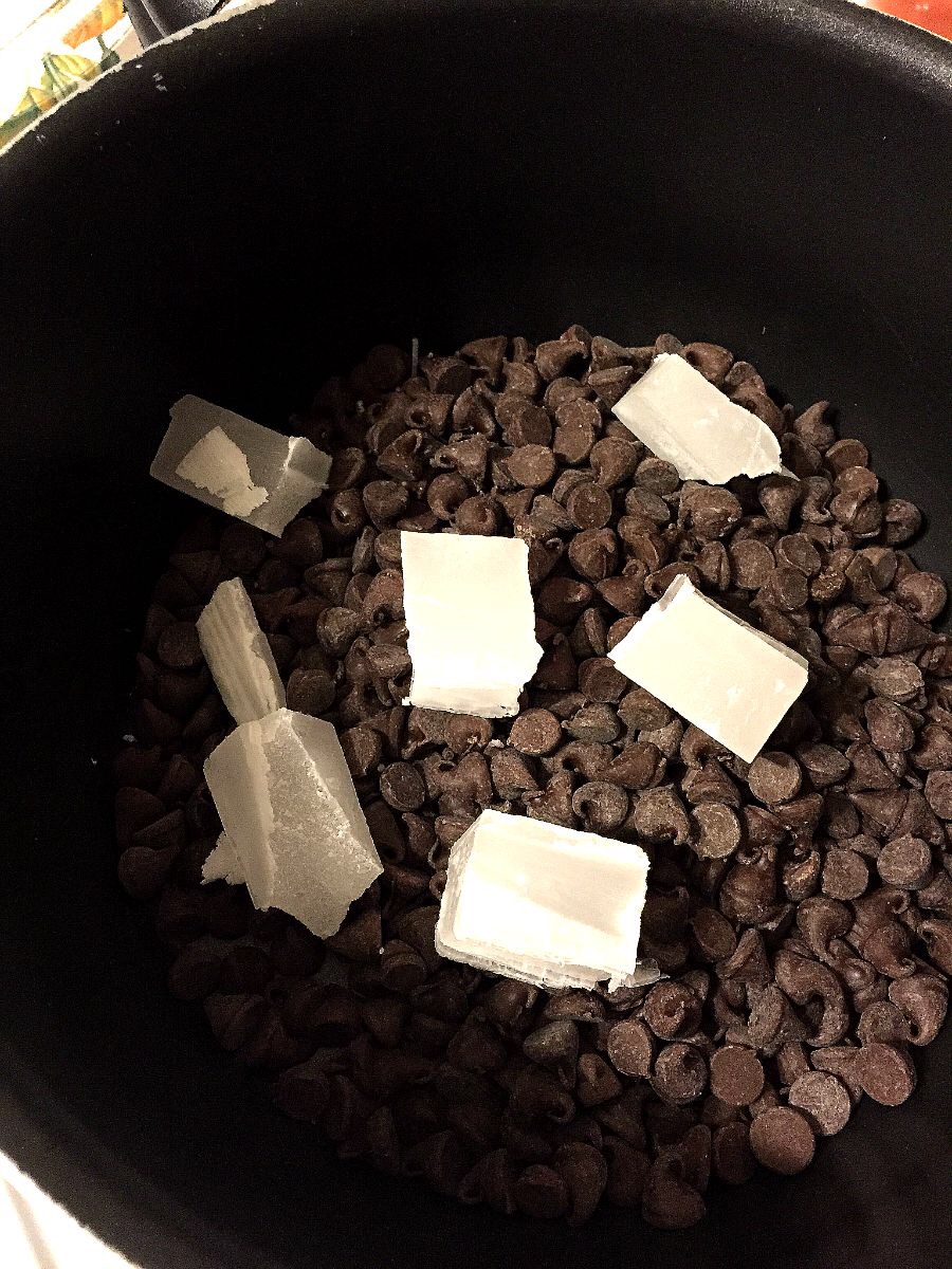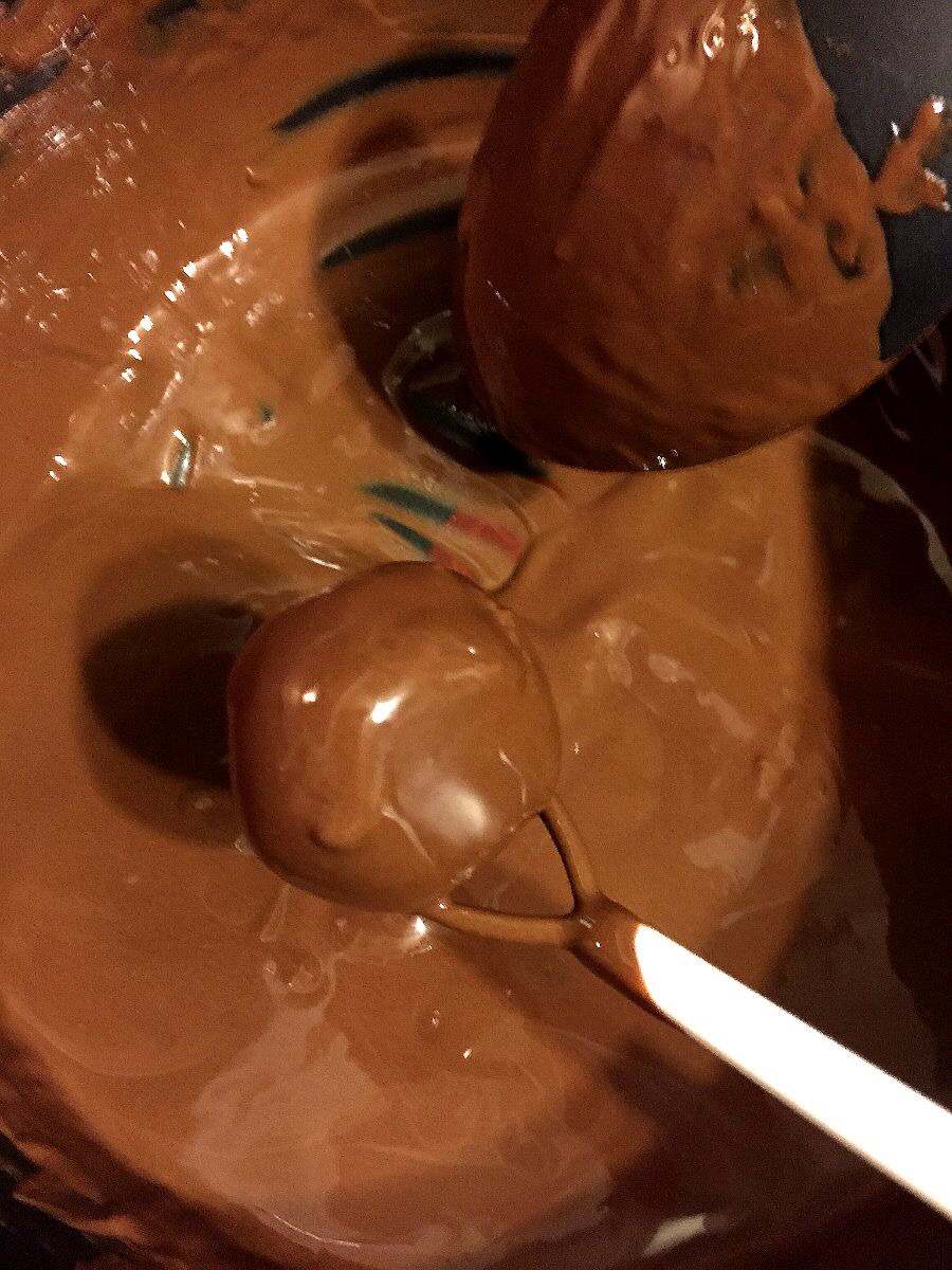 Once they’ve chilled you can start on my favorite part, the chocolate coating. *grin* You’ll need to melt chocolate chips with a little paraffin wax in a double boiler while stirring frequently until it’s melted smooth. If you’re using two saucepans in place of a double boiler, make sure that the top pan does NOT touch the water in the bottom pan, or else the chocolate may scorch or seize. I’ve also found that cutting up the paraffin really cuts down on the stir time and therefore less worry about ruining the chocolate. I didn’t pay close enough attention this round – cut yours to about half the size of what’s in the picture for an even easier experience. (By the way, if the idea of the wax grosses you out, you can totally leave it out. Your Bon Bons won’t have the gloss and harder shell, is all. You’d be surprised how much wax you regularly ingest anyway, though, so this little bit truly isn’t a big deal.)