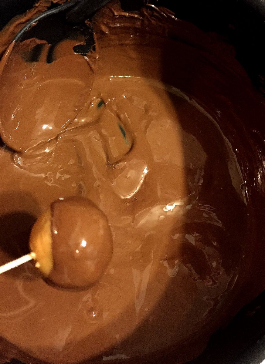 Dip the chilled peanut butter balls into the chocolate, let the excess drip back into the pan, and then place back on your wax paper lined cookie sheet. They can get a little squirrelly when you’re dipping, so you may have to get creative in order to make sure that they’re fully covered. Spin them, swirl with your fondue dipper, pour some over the top with your spoon – whatever it takes. My mom has the spinning toothpick technique down while mine tends to include a little jig (I wish I meant the Bon Bon), swirling the ball with the fondue dipper, and then covering any missed spots by pouring some chocolate from the spoon. You know me, I can’t do anything like a normal person. *grin* That dance is essential for my success for some reason.