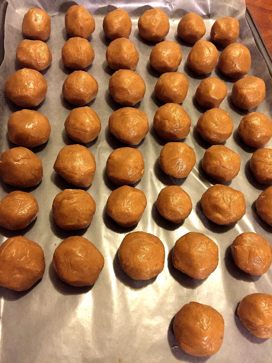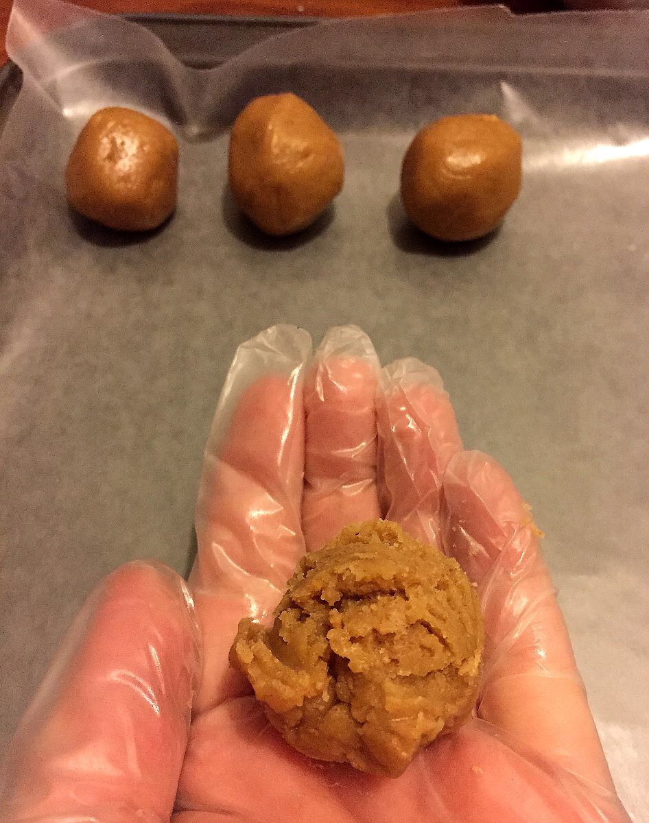 Chilling worked perfectly for me and you can either grab a little out by hand or use a small scoop, like me. The mixture should be thick and hold together pretty well, yet is still pliable, so it can be shaped into balls. Prep a cookie sheet with some waxed paper for easy cleanup. Powder free vinyl gloves work wonderfully, too.