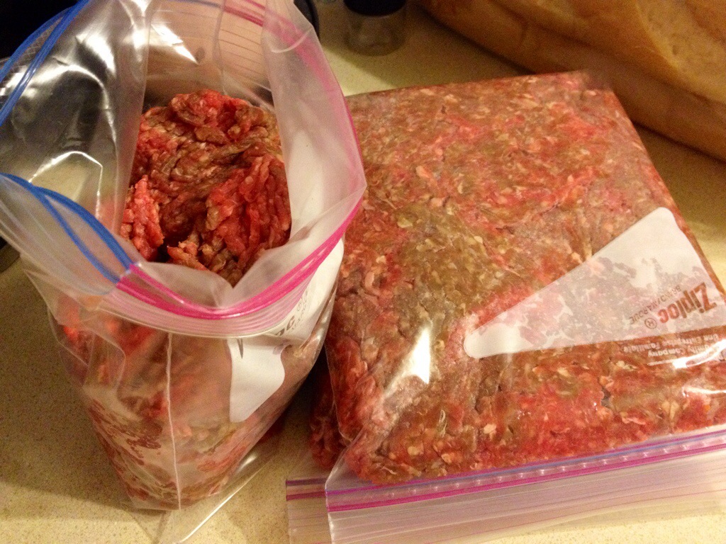 We actually bought a smaller bulk package of lean ground beef this time, but fitting over five pounds of it into my freezer while I still have leftover buckets of ice cream from the 4th of July was still going to be a challenge. If you think about how you’re packaging your meat before you freeze it, you can get it all to fit so easily and it’ll make you look like the new Martha Stewart. Who doesn’t want to look all organized and on top of everything?!