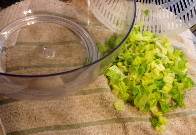 Next, give it a really good rinse. I used to rinse first, but then I found myself washing it all again once it was cut, because chopping exposed the rest of the lettuce to the hidden yucky spots that I throw out. Save yourself the work and water – rinse after you’ve cut it all up. By the way, that’s one head of romaine in the picture. Once it’s all clean you need to get it as dry as possible. This is a seriously important stage. I’ve learned that the more dry the greens are, the longer they last with this method. If you have one on hand, I recommend using a spinner. I then empty the spinner onto a towel and dry the lettuce with a few healthy pats (and shakes, rolls, and pretty much anything else I can manage lol).