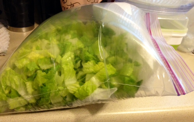 Now, I’ve tried prepackaged salad and fresh romaine leaves. Since I can get a lot more lunches out of 3 heads of romaine leaves, I put in the extra work now. I cut off the bottoms of the heads, because this method really only works well for the leafy green parts, plus we’re not big fans of the bitter bases. I then cut up the leaves, which also gave me a chance to sift through the lettuce to dispose of any areas that were browning or wilted.