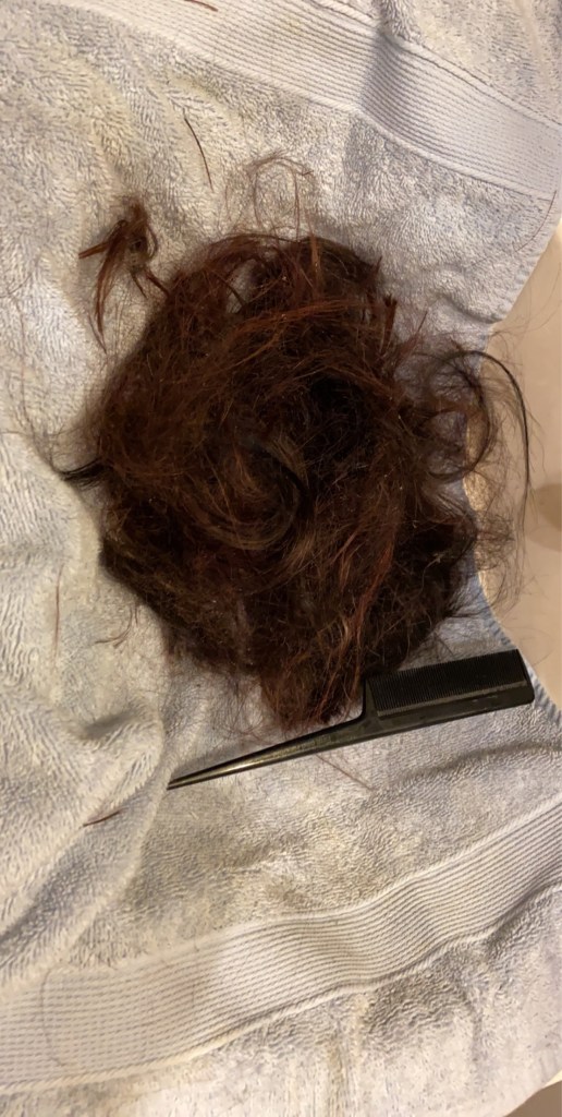 After a little bit of time on a step stool and buzzing hair below the clip where I’d piled the “don’t undercut” hair, and attempts to make an even guide line for the undercut using mirrors without my glasses, thankfully my mom came to the rescue. 😂