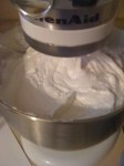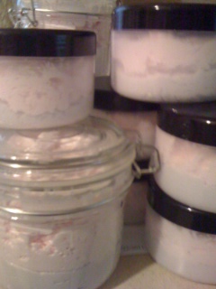 All right, I had my dramatic sigh, so I’ll leave my pride for my next post, and will recount the rest without worrying about how clueless I was. lol I approach most bath recipes, and especially when creating my own product recipes, much as I do with a baking recipe. Instead of food I get out what supplies I’ll need and will measure out the appropriate amounts of ingredients, if I know, to help minimize mistakes. (Yeah, how I missed just how much 5 cups of sugar is while making this is still a mystery to me…) I decided that I really wanted to try making the black forest cake scent blend that I’ve been pondering for quite a while and got those FOs out. Oh yeah, I was prepared with a paper plate to hold the pipettes (awesome super tip a crafter wrote in a review on an FO that I bought was to rubber band a pipette to each bottle of FO and EO, fragrance and essential oil, and always use it just for that oil. It cuts down on the waste and cost, since you’re not washing them out every single time you need a ML of another scent or tossing it in the trash when you’re done. Also, no cross contamination, since no matter how careful you are at rinsing those pipettes or even measuring spoons, a little bit of that oil will find a way to hitchhike to the next oil, which doesn’t happen with this method!), measured out the glycerin into a beaker, diced and melted the soap, and then set the rest of the ingredients on the other counter, since they were variables. At first I thought I would multitask like the recipe describes (I know, I know – stop laughing!), so I added the bath whip and glycerin to the mixer while the soap was melting. Well, until my whip spatula (*raising an eyebrow* don’t even go there) decided that it didn’t want to get the last two ounces out of the container and I realized that the soap was going to get way too warm and frothy if I took much longer. You guessed it…mixer going on low, spatula stuck in the jar (tipped over, of course, since if one thing is going to go wrong, it wants company), and stumbled over the sleeping dog at my feet to turn off the microwave. Soap doesn’t have a real set time for it to melt…it’s more like a car started in the snow…it’ll be warm when it wants to be, so I set it for a set amount, then hit add 10 seconds or stop depending on how it is behaving (which also depends on if I’m wearing shoes and can see into the microwave, of course…otherwise it has to go another 10 if I had to pull it out to peek lol). Of course the soap was fully melted at this point and I got it out just before it became frothy (it’s not a bad thing if it becomes frothy, per se, it just means there will be more bubbles in the pour, so it becomes a habit to think of bubbles as bad, even when it’s never going to be seen…soap can burn, but thankfully I’m too nervous to ever let it sit that long unattended). I pour the soap into the mixing bowl, then end up with elbows out, jar in every position possible, trying to get the remaining whip with a spoon as quickly as possible, since soap loves to set when you need a little more time. Thankfully the spoon worked and the three ingredients transformed into this incredibly awesome fluff. Do you ever get that moment when you’re warming the jar of marshmallow creme/fluff, it starts to bubble out of the jar, and your inner child starts to urge you to poke the cool looking cloud of marshmallow? (I know it’s not just me *grin*) Well, I was given an excuse to play in the fluff this time! Cue evil laugh…Anyway, as I slowly started to add the sugar to the fluff I had to scrape down the sides, just like with a frosting (by the way, sugar isn’t that fond of bath whip I learned…the main portion of the mixture resisted the sugar as long as it could), and then I indulged the desire to stab it with the spatula a few times. I may or may not have yelled en garde as well. *shrug* I started noticing after the third cup just how much scrub was in the mixture now and slowly added the rest as directed. I then scooped out some scrub into two bowls to get mixed with some scent and color later (that’s one part I will not describe; oh man did it take forever to scoop that, since I have no big spoons that are sanitized for using with my products, because I’ve never needed one before). Yet again I managed to screw up and eyeballed the amounts instead of measuring, since measuring always means that some portion of the mixture will be lost from sticking to everything used. I ended up with half of the mixture in my mixing bowl and the other bowls being more like a quarter each, instead of dividing into three equally. I added my new cherry FO and some color, and my fluff looked so beautiful! I suddenly had a WTH moment and realized that I hadn’t thought out the whole three different colors and scents thing, since I only have one mixing bowl. A massive Pampered Chef measuring bowl came to the rescue (I made 8 cups of cherry alone! Duh) and I dump one of the remaining portions into the mixing bowl. Since it would all be touching in the jars I didn’t wash it down and knew that it would help the scents to connect if there was a tiny bit of the residue from the first in the next, etc. I was delighted with the wafting aroma of chocolate with a touch of cherry (I hadn’t realized at this time that I had been leaning over the empty bowl and had the little bit remaining all over myself) and started coloring. It, uh, well, the colors decided they had their own agenda. Instead of a chocolate color we decided that periwinkle would be an interesting shade (yeah, such a wth moment) and I realized that this wasn’t working out right, so I dumped the other remaining bowl into the mix and added the buttercream FO. In for a pound now anyway. Well, that’s apparently enough FO to give a thin texture to the scrub at this stage, so I, being a quick thinker (it’s okay, you can shake your head if you all ready figured out what happe