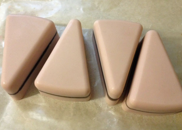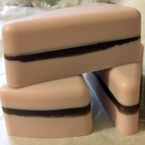 Still high on my hot pinkness a few days later I unmolded the super chocolaty smelling pancake soaps and opened my special monojects. Being able to do find detail soap would allow me to carry out a ton of ideas that have been set to mute for now, because they need that extra special detail work. I melted some white soap, left it unscented, and sucked some up in the monoject. I rushed over to the short stack and tried to eject the soap while I swished my hand back and forth to do that fancy squiggle chefs do with icing or sauces. I tried so hard to depress the plunger that my hand actually hit the soap when the plunger finally sent itself flying backward. (There’s a tiny smudge that I tried to cover with the next round of “cream cheese”, but hopefully it’s not super noticeable.) Apparently getting the soap extra hot didn’t overcome how quickly it can cool in a thin tip.