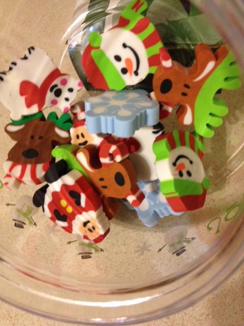 Aren’t they cute?! They’re not “worms in dirt”, but I think they will work perfectly in the Dirt FO as a stocking stuffer. *grin* I also found some cute holiday erasers to embed. I might have mentioned them before, but I don’t think I shared a picture. I think guest rounds with one or two of these would be pretty adorable.