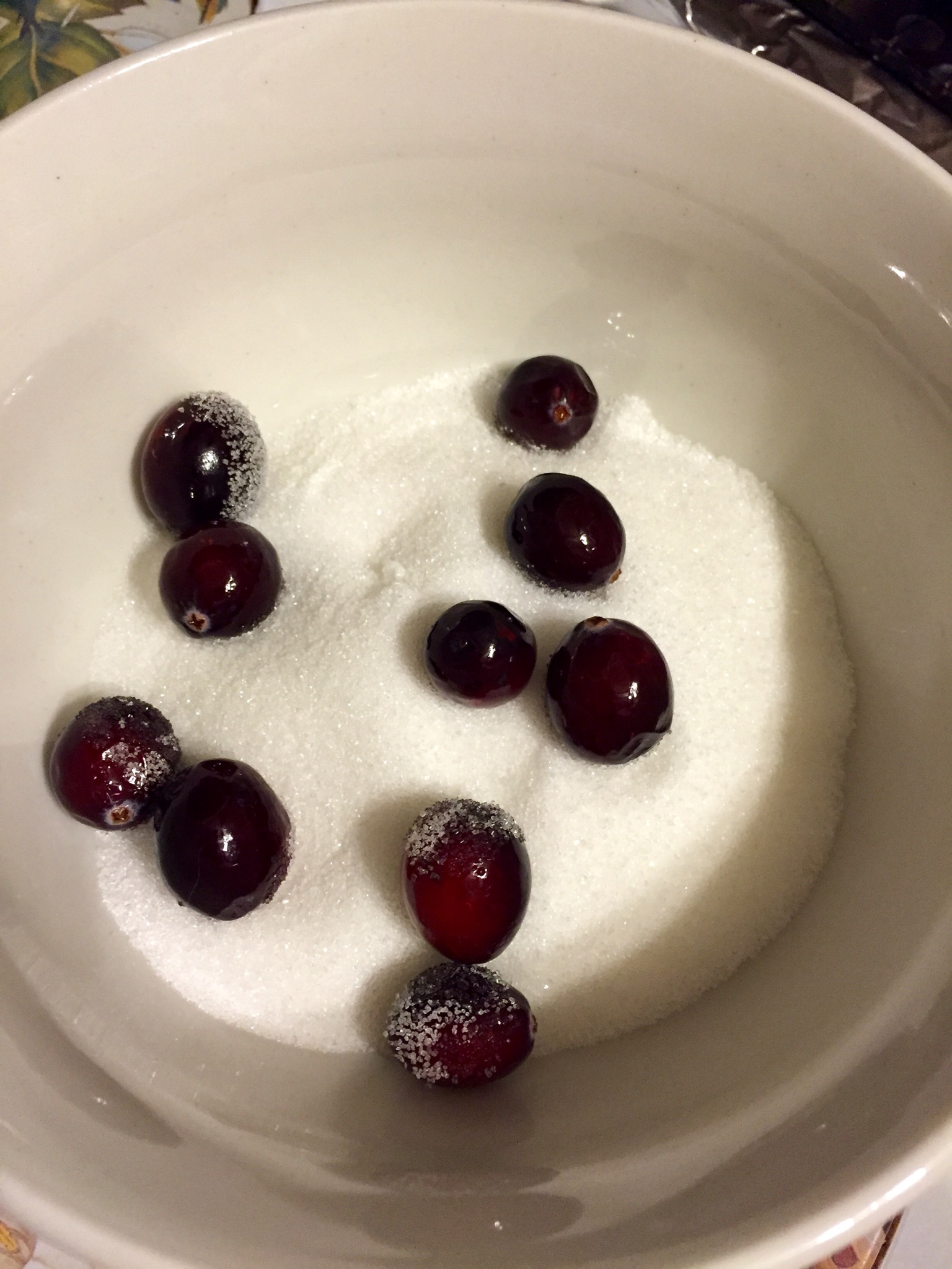 I’ve been working on a little festive snack to have available for munching. I’ve been hoping that although it’s not overly healthy, it’s a step into getting Larry to start eating fruits. *grin* So when one of my favorite blogs posted a recipe for sugared cranberries I figured this was the one that would probably be the most likely to succeed with Larry. He loves tart and sour foods, as in he can actually straight up eat a lemon and enjoy it. *shuddering in mock horror* I’m more into mild flavors, probably because of my sensitivities from my illness that makes most regular things pack quite a punch to me.