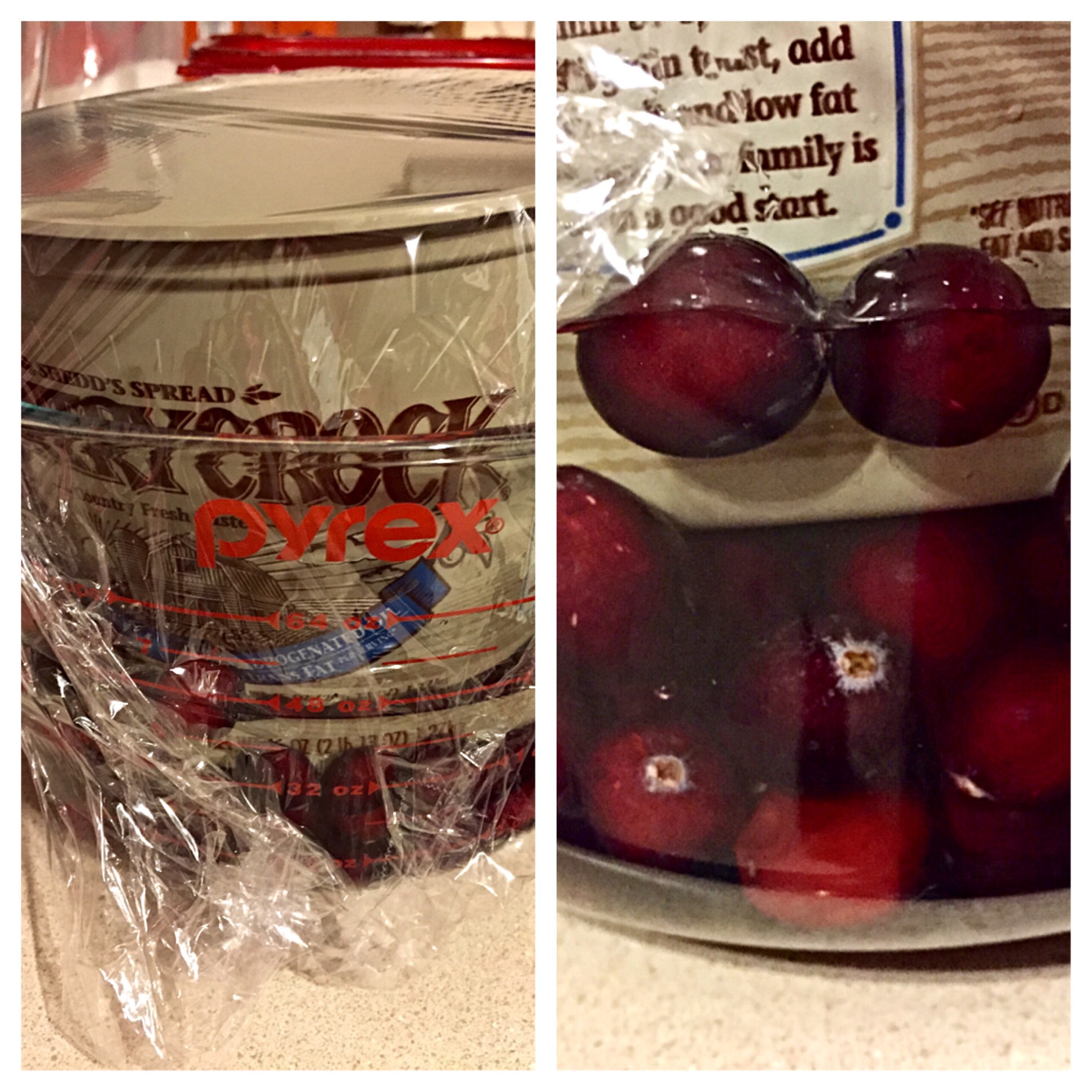 Since cranberries naturally float I had them in a large measuring cup with the syrup, and then an empty margarine tub filled halfway with tap water to work as a weight, which I placed on top of as many of the cranberries as possible, and then I wrapped it in plastic wrap to try and keep the cranberries as submerged as possible. Basically: