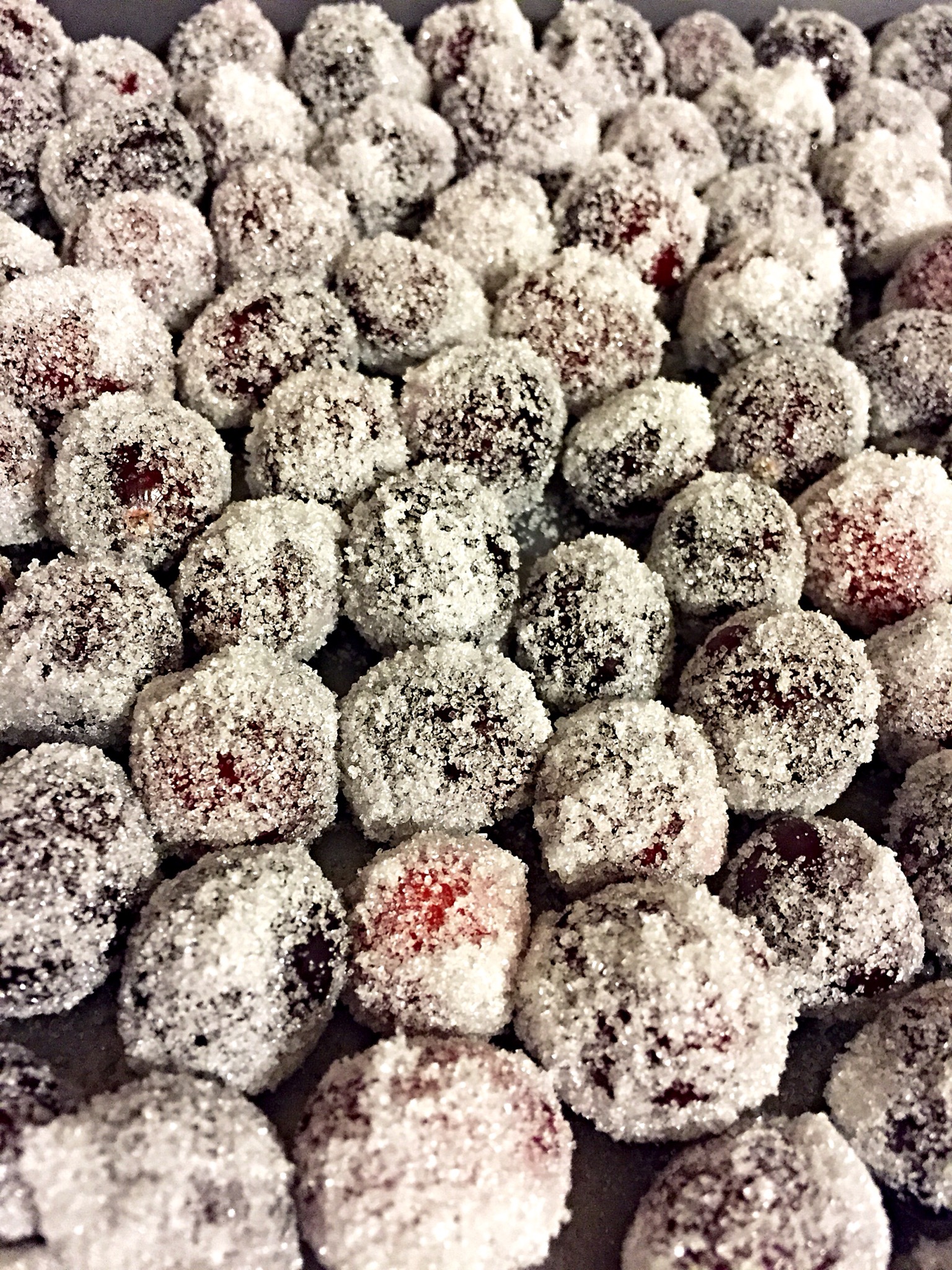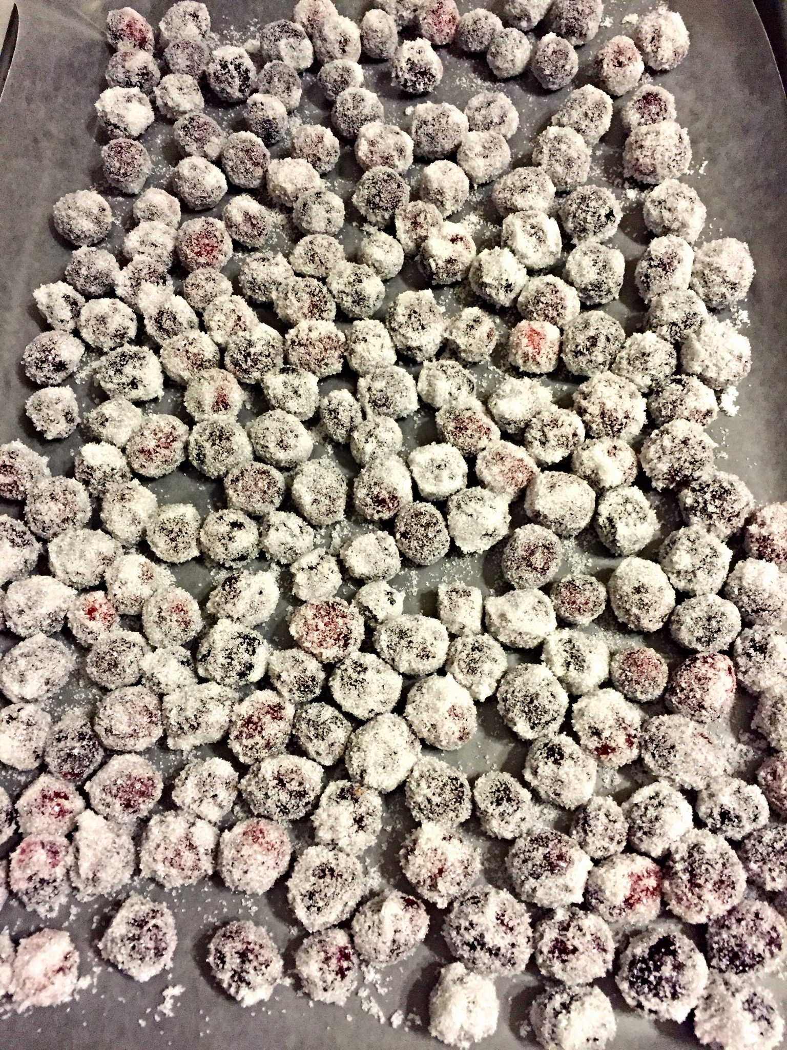 After they’ve dried you put a handful into some sugar and coat them. Now, I had a brain fart when I made my grocery list and forgot that the recipe recommends a coarser sugar, so I only had plain granulated sugar. It works, but you can’t just roll them in the sugar and call it good. To make a good coating with plain granulated I found that rolling all of the handful together first, and then working individually after that worked best. The initial roll keeps any of them from sticking, especially if they are bouncing into one another while you work the sugar around. Then I found that mounding and patting the sugar onto the berries seemed to hold the best. The coarser sugar is supposed to cover the berries much better and I bet it’s much easier to work with for this. Anyway, I also noticed that the longer I worked, the coarser my sugar became because of the syrup clumping some of it, and the better it covered, so when I ran out of sugar and had to add fresh, I dipped my fingers into some syrup and then swirled into the sugar. My fingers got coated, so then I just rubbed them together and let the clumps fall into the sugar, and mixed them into the rest of the sugar. It made all of my fresh sugar a bit coarse and the coating process went much faster then.