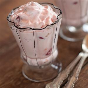 My notes: We love this dessert, but we’ve tweaked the recipe a little. First, we prefer to use crushed pineapple. It seems to incorporate a lot more thoroughly, so there aren’t just pockets of tanginess. Second, we prefer to make the chiffon creamier, so I actually use two tubs of cool whip. And last, everyone loves the marshmallows, so I add the whole bag of marshmallows. It makes the dessert a bit sweeter, but gives more umph to the texture, and people can just cut back on the portion size if it’s too sweet to them. In all of the years that I’ve made this I haven’t noticed a difference in brands of the sweetened condensed milk, but I have noticed that some brands of pie filling has a few pits in them, so watch it carefully as you dump it into the bowl. I usually empty the can into the bowl first, just so that I can double check, although Comstock brand has the least problems. The chilling is a huge part of making this dessert impressive. It gives the chiffon time to set up and get super fluffy instead of just creamy, so don’t get impatient and try to serve it quickly. I’m adding a picture of it, although it’s the picture that Eagle Brand posted of it, since they’re experienced with setting up food shots and I’m not. Mine didn’t look nearly as pretty. One thing to note though is that they didn’t let theirs set up, so it looks uber creamy instead of fluffy. Expect yours to look more like the inside of a meringue, all airy, especially if you indulge with my version.