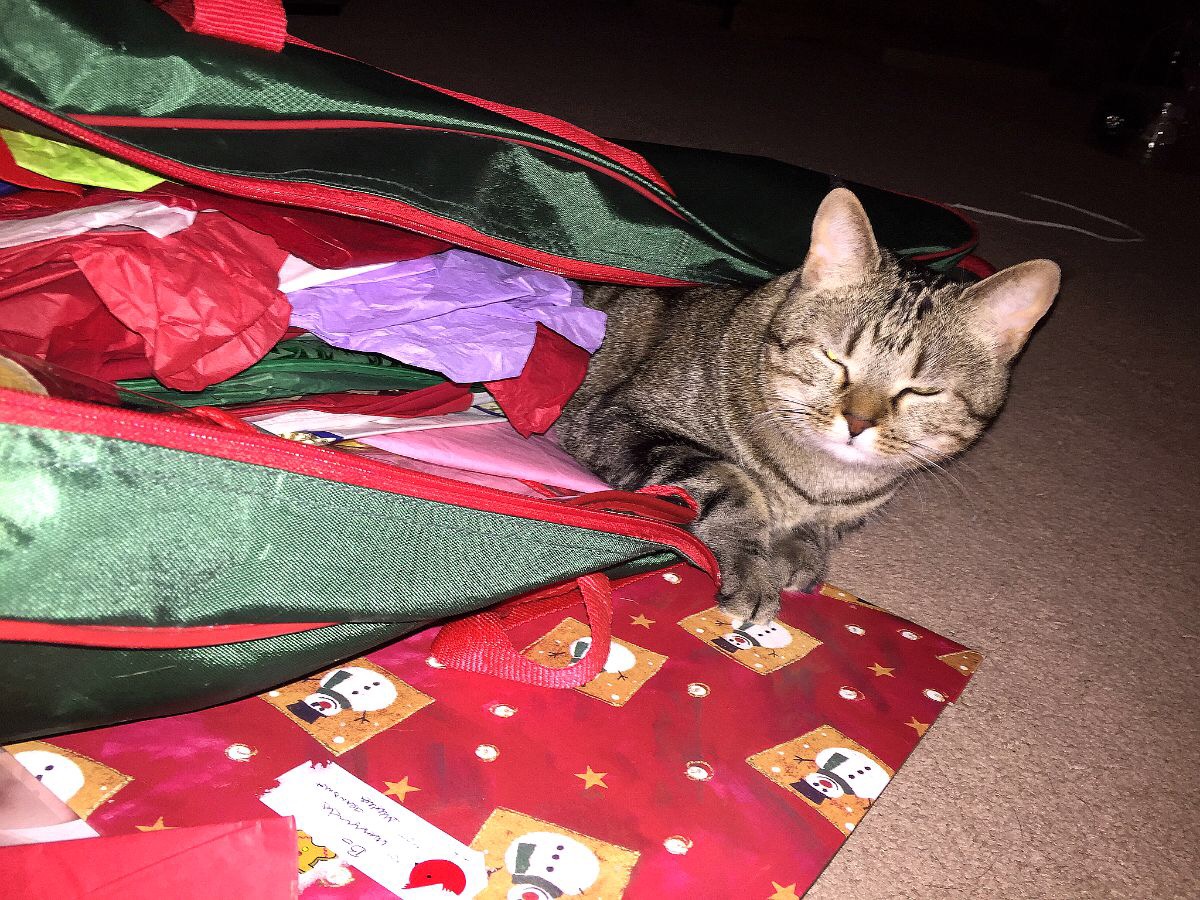 My poor mailman delivered the first load of my Amazon lightning sales stuff, so I started wrapping presents tonight. Little Miss Abby got in trouble by smacking the scissors as I cut paper, ripping the wrapping paper itself as well, and decided to dig around in my tissue paper and ribbon organizer (and made a big ole mess of it too! Lol). She acted like queen bee for having “helped”, but she was quite a handful. I couldn’t be angry when I saw where she had settled. The flash made her squint, but she had the cutest, most proud of herself, face at the time and how cute is it that she climbed into the organizer?!